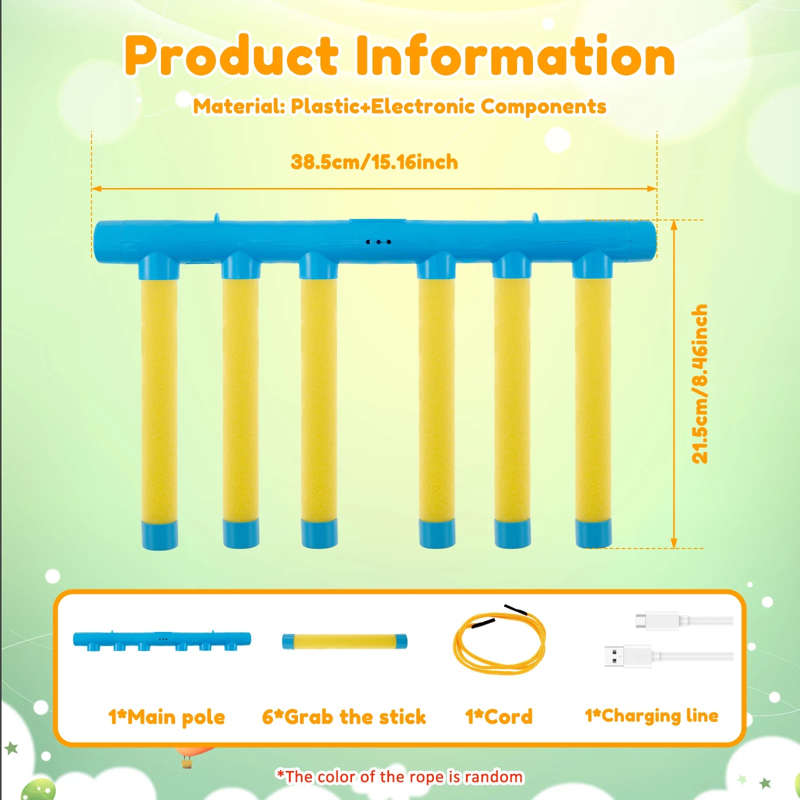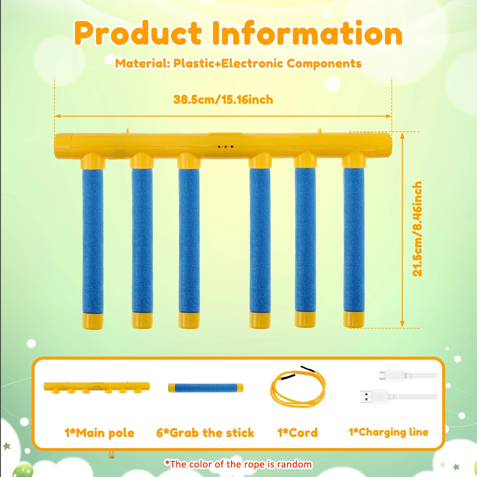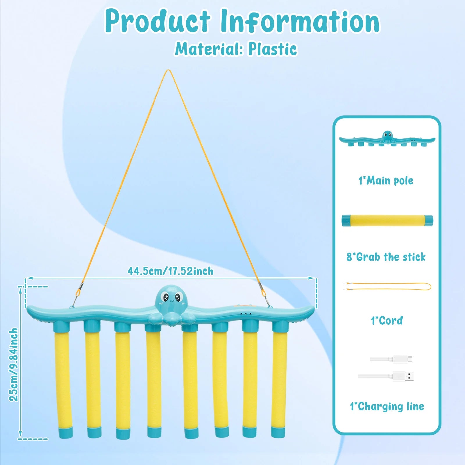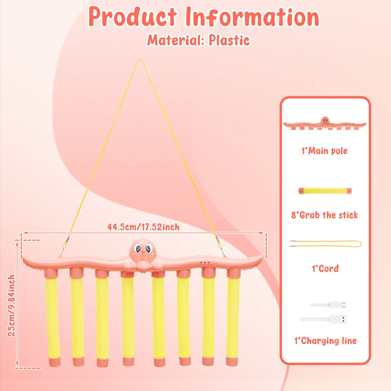 Beeldvertaling: “Product Information – Material: Plastic”. Afmeting: 44,5 cm × 25 cm (L × H). Inhoud: 1× hoofdstaaf, 8× grijpstok, 1× koord, 1× oplaadkabel. Gemaakt van duurzaam kunststof voor langdurig speelplezier.