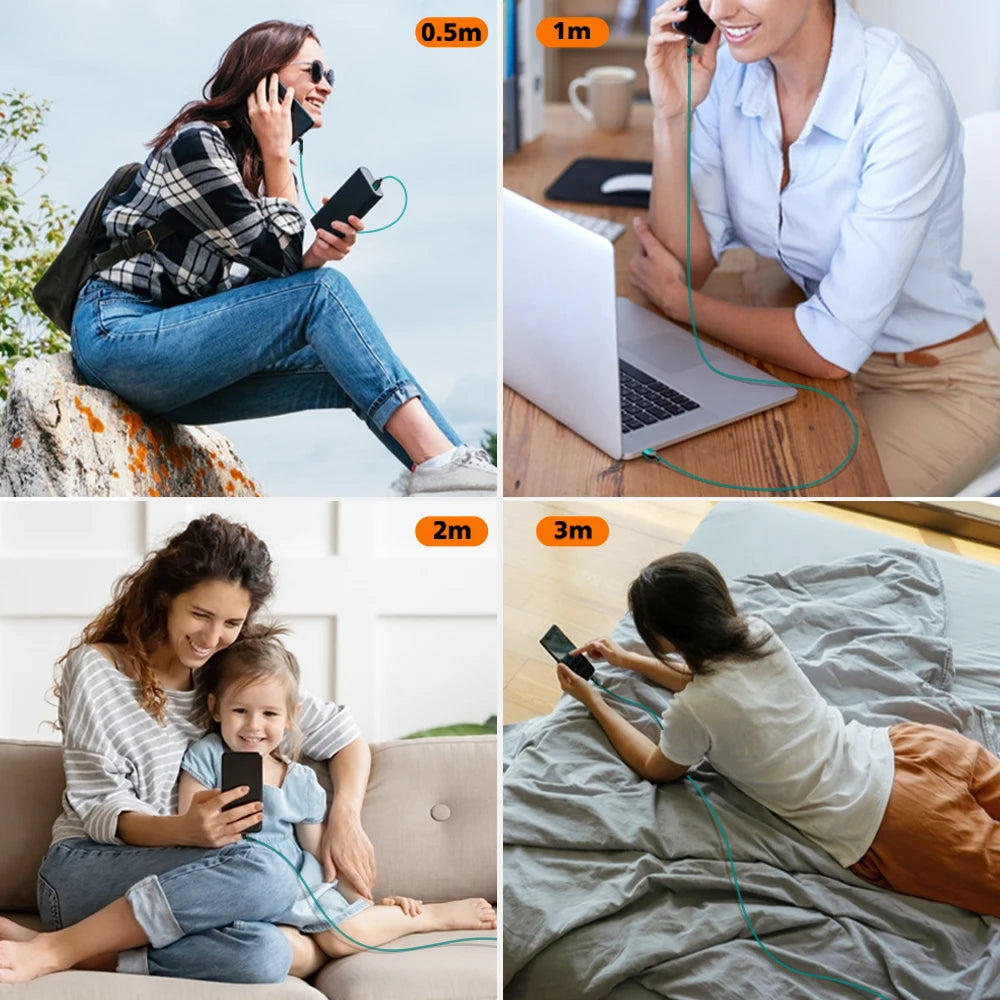 De kabel wordt geleverd met drie verwisselbare magnetische aansluitingen, geschikt voor Type-C, Micro-USB en iOS-apparaten. Kies eenvoudig de juiste aansluiting bij het bestellen.